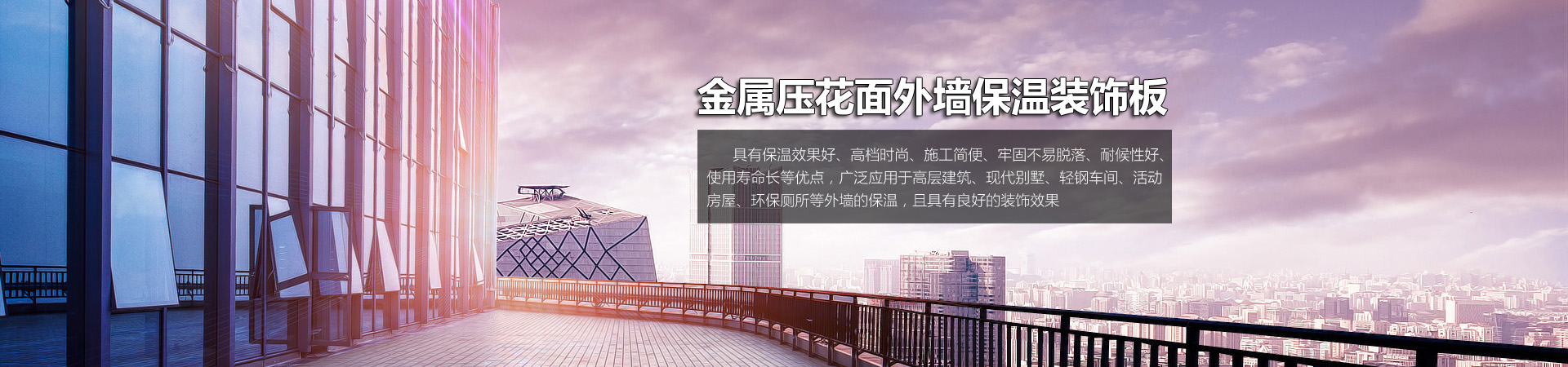 公司擁有先進的金屬壓花面外墻保溫裝飾板電腦控制自動生產線,年生產能力40萬平方米,可生產磚紋、彈涂紋、水波紋、木紋、礫石、細石、理石等多種紋樣花型、和多種色彩的產品,能全方位滿足中高檔寫字樓、商品住宅樓、現代別墅等建筑外墻保溫及裝飾的需要?!驹敿殹?